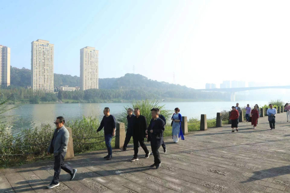 滨水岸线是稀缺的自然资源,“三江六岸”是合川重要生态廊道。在东津沱滨江公园,采风团探访了合川三江最美生态线,了解到合川坚持生态优先、绿色发展,推动嘉陵江、渠江、涪江流域生态廊道共建共治,把三江六岸水岸线既作为防汛抗洪的重要防线,又作为生活、生态、景观功能的重要载体后,作家们纷纷点赞。